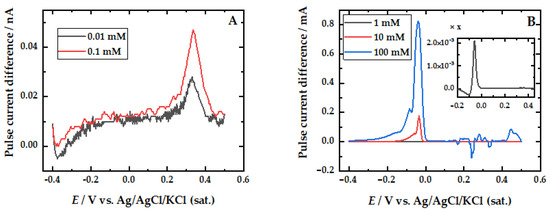 Square-wave voltammograms recorded for a gold microelectrode of 10 µm diameter in 3.5 wt.% NaCl (pH 3.5) + x mM CuCl2 solution. (A) For x ≤ 0.1 and (B) for 1 ≤ x ≤ 100, as indicated in the plots. Deposition time: 10 s.