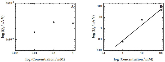 Dependence with the concentration of Cu2+ ions for some relevant signals observed in the square-wave voltammograms of Figure 5. The plots show the integration of the square-wave voltammetric peaks recorded around (A) +0.35 and (B) −0.1 V, respectively.