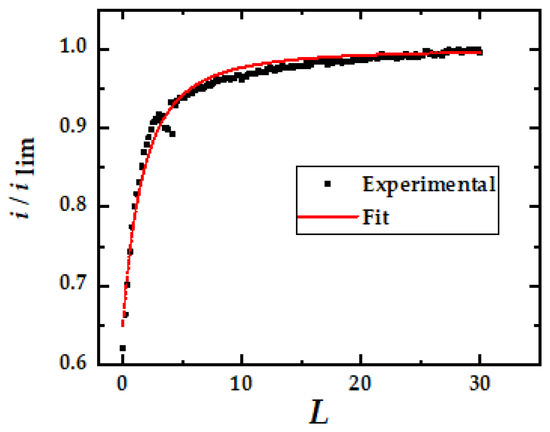 In order to illustrate the ability of the Au microelectrode to locally determine Cu2+ ions arising from a corroding copper source, a metal surface consisting of a copper disc of 125 µm in diameter embedded in insulating resin was analysed. In order to precisely place the tip above the copper sample and establish a sensitive tip-substrate distance for mapping, an SECM operation was performed in the feedback mode using ferrocene-methanol as the redox mediator in a concentration of 0.5 mM. In order to minimise the corrosion of the copper substrate during the tip positioning step, this operation was performed in a more dilute NaCl concentration (namely 0.5 M) without acidification. The positive feedback mode consists of determining the oxidation signal of an oxidisable complex through an outer sphere mechanism, such as ferrocene-methanol, which can also be regenerated from the oxidised form on conductive materials with an adequate electrical condition. On the contrary, if ferrocene-methanol, as a redox mediator, is oxidised at the tip of the SECM when it approaches the surface of the insulating resin adjacent to the metal, the diffusion-limited current of the mediator will be hindered. Numerical estimates make it possible to model the approach current profile and precisely determine the distance between the gold microdisc and the surface under study [47]. Figure 7 shows the approximation made on the resin by applying a potential of +0.4 V to the tip (thus, in the diffusion-limited regime of the mediator oxidation reaction). This fit was carried out by considering the distance and the normalised current that corresponds to the ratio between the current measured at each location to the limiting diffusion value measured in the bulk of the solution. A normalised distance L was also employed, that is obtained by dividing the actual Z value by the radius of the microdisc (i.e., 5 µm).