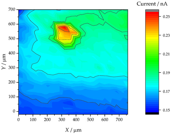 The fit also provides geometric information relating to the diameter of the glass body of the tip that surrounds the gold disc of the microelectrode. In our case, the glass disc at the tip was 11 times larger than the gold microdisc. Additionally, it was determined that the height L = 0 at which the approach was stopped actually corresponded to a real distance of 1.65 times the radius of the microdisc (i.e., 8.25 µm). Next, while maintaining this distance between the tip and the sample, a two-dimensional scan was performed to locate the copper wire surrounded by the resin. To do this, we exploited the capacity of copper to regenerate the redox mediator and thus locally increase the current when the tip passes over it, which was observed in the map shown in Figure 8. Once the sample was located, the electrode was held over its position at the same distance of 8.25 µm and the solution was replaced with a 0.5 M NaCl solution at pH = 3 but without containing ferrocene-methanol. It must be noted that in this acidic electrolyte, copper corrosion is distributed over the complete exposed surface with a behaviour that is often described as homogeneous corrosion. That is, although copper dissolution will not happen in a heterogeneous manner in this case, the goal was rather to be able to obtain signals related to copper dissolution in real time with the SECM tip that could be associated with positions in the surface to achieve spatial resolution. Once the proof of concept is demonstrated, the methodology can be extended to the investigation of copper-based materials under conditions of localised corrosion, a work currently underway at our laboratory.