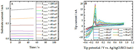 Once the sample was connected as the second working electrode, voltammograms were recorded at the tip while a constant potential was applied to the copper sample. These measurements were conducted with the tip placed directly over the copper substrate. In this way, the amount of dissolved copper present near its surface could be quantified with the gold microelectrode as the first working electrode, because the anodic dissolution conditions of the sample were forced. No significant signal was obtained until the sample was polarised at –0.1 V. Figure 9A shows the current transferred by the substrate for each experiment, and Figure 9B shows the cyclic voltammogram obtained simultaneously at the tip.