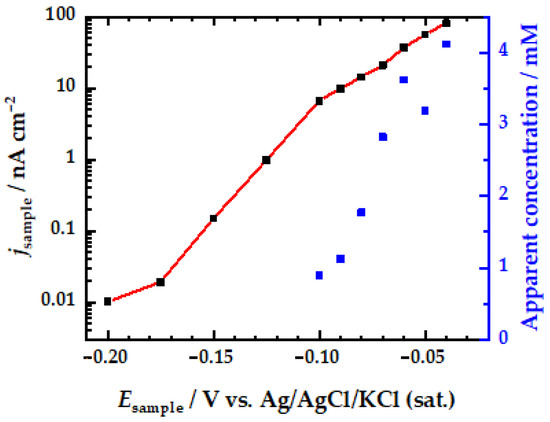 Voltammograms recorded at the tip showed cathodic diffusion current signals and reoxidation peaks that allow for quantification of the amount of copper present in the electrolyte at approximately 8 µm from the surface. Concerning the limit currents, the possibility of transforming them directly into current values using Equation (2) [9] makes it possible to compare the current values transferred by the sample (by means of current density) at the end of each experiment, with the apparent concentration determined using the microelectrode. As shown in Figure 10, concentration values between 0.5 and 4 mM are obtained, consistent with the emerge of an anodic stripping signal not leading to high activity and being able to initiate passivation phenomena.