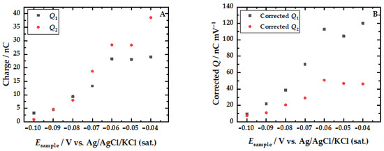 From the inspection of Figure 10, it is shown that the release of copper ions is not appreciable until a potential equal or more positive than −0.1 V was reached. Next, the values obtained suggest comparing the reoxidation results with those obtained with the same test solution with CuCl2 concentrations between 1 and 10 mM. Figure 11 shows the charges transferred during the reoxidation processes on the microelectrode, which again shows two reoxidation peaks due to the transformation of Cu into Cu+ and then into Cu2+. However, due to the use of a different reference electrode and experimental errors, the range of potentials used during cyclic voltammetry is not the same as that in the experiments carried out in the solution in the presence of salts of copper. This poses difficulties in the interpretation and extrapolation of the results. To resolve this problem, we corrected the charge transferred during the reoxidation by dividing it by the interval of the potential window, given in mV, in which the progress of the electroreduction of copper is observed. That is, the transferred charge values were divided by the potential window which begins at the start of the copper reduction wave during the cathode scan and which ends when the oxidation peak begins, providing the results in Figure 11B.