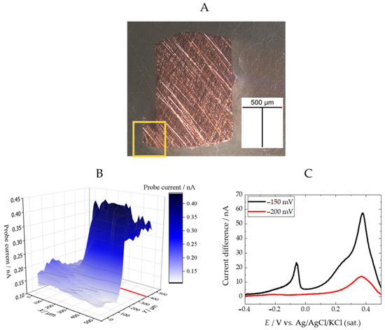Finally, the imaging of a copper corrosion experiment was performed using a larger coupon of non-circular shape, as shown in Figure 12A. Now, Figure 12B shows a 3D SECM map obtained in feedback mode of a section of the unbiased copper sample, indicated by the square drawn in Figure 12A. This 3D map was recorded over a 500 × 500 µm2 area that partially covers the metal and the surrounding resin to observe differences in electrochemical behaviour when the sample was immersed in a solution of composition 0.1 M NaClO4 + 0.5 mM ferrocene-methanol (in order to minimise the corrosion rates in a chloride-free and non-acidic environment). Figure 12B shows a large variation in the currents measured at the tip depending on whether it moved above the organic resin or the metal. Since the metal has the capacity to regenerate the redox mediator on its surface by providing electrons from its valence band even if polarisation is not applied, greater redox mediator concentrations are found by the tip placed over the metal, whereas the resin is a dielectric insulator incapable of supporting a redox reaction. Therefore, the tip monitored faradic current values close to zero when it was placed above the resin in the region 0 ≤ Y ≤ 150 µm.
