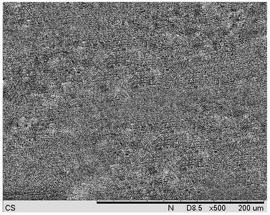 A carbon steel plate of A283 Grade C was used, whose chemical composition and physical properties are presented in Table 1 [] and Table 2 [,]. The SEM image of carbon steel A283 Grade C as received is shown in Figure 2.