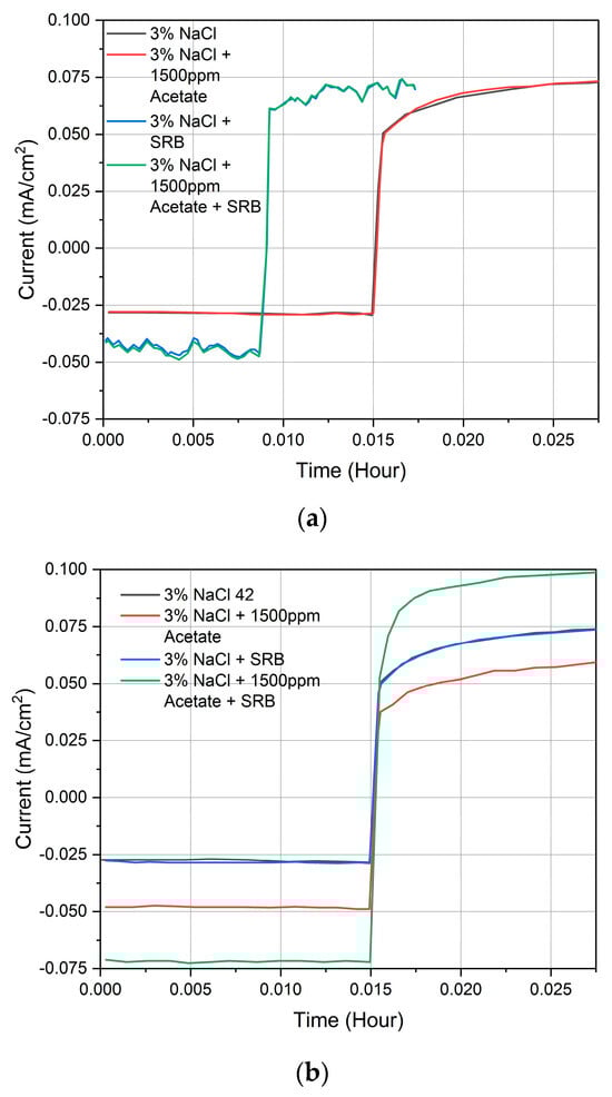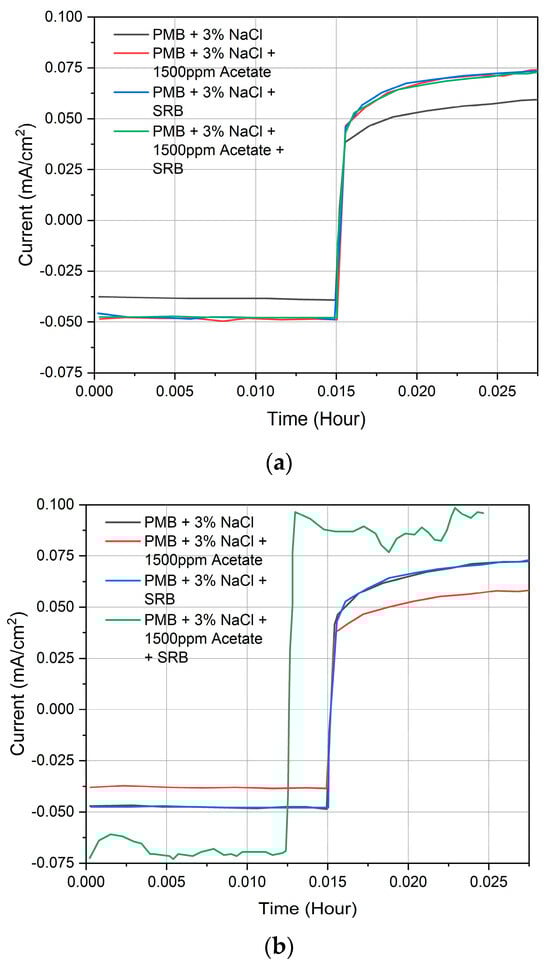 The overall LPR results for current (mA/cm2) vs. time (hour) are shown in Figure 12. Figure 13a shows the LPR corrosion rate vs. time for Case B and provides a visual representation of the variability in data points across the three trials conducted for this case. The presence of acetate decreased the corrosion rate by 8.8% (from 1.55 mm/year to 1.42 mm/year). However, with acetate and SRB, the corrosion rate increased to 32.9% (from 1.75 mm/year to 2.44 mm/year), corresponding to SRB kinetics producing corrosive byproducts, further speeding up the corrosion of the carbon steel.