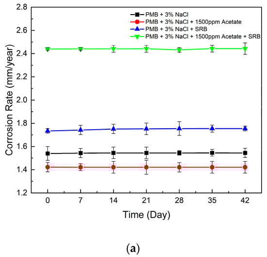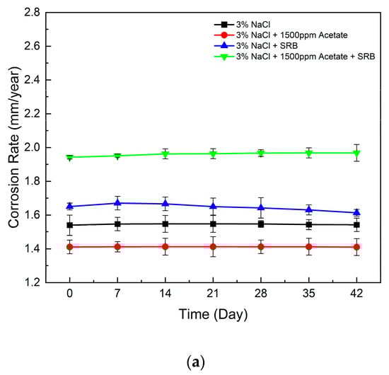 A similar observation was noted in the weight loss immersion test, as shown in Table 5, and Figure 10b provides a visual representation of the variability in data points across the three trials conducted for this case. The corrosion rate decreased with the presence of acetate by 45.9% (from 0.83 mm/year to 0.52 mm/year). However, with acetate and SRB, the corrosion rate increased by 17.2% (from 1.01 mm/year to 1.20 mm/year). The presence of acetate in the SRB environment can thus substantially increase the corrosion rate.
