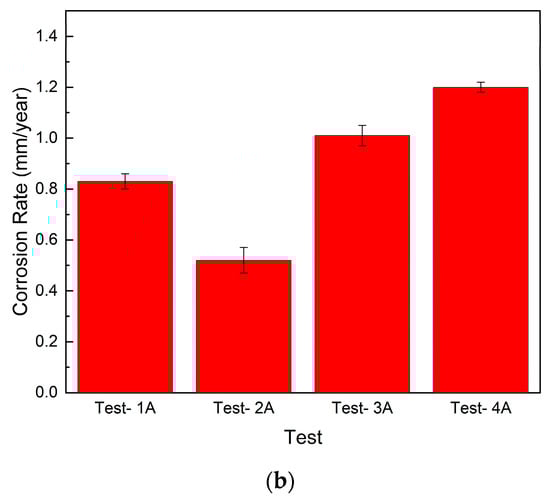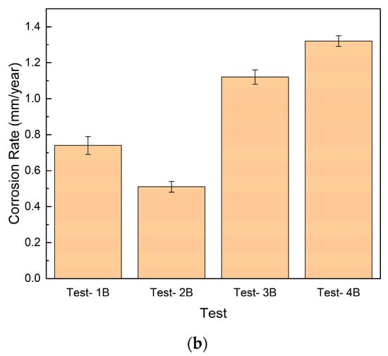 Similar observations were found in the weight loss immersion test, as shown in Table 6, and Figure 13b provides a visual representation of the variability in data points across the three trials conducted for this case. The presence of acetate corrosion decreased the corrosion rate by 36.80% (from 0.74 mm/year to 0.51 mm/year). However, with acetate and SRB, the corrosion rate increased by 16.4% (from 1.12 mm/year to 1.32 mm/year). These findings demonstrate that acetate and SRB could significantly increase the severity of corrosion of carbon steel.