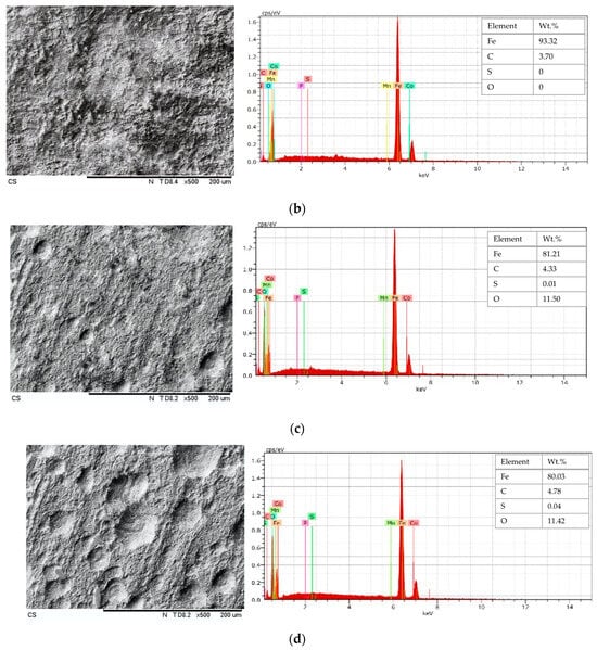 From the SEM images in Figure 14a,b, representing Test-1B and Test-2B, respectively, the formation of a black film of iron carbonate can be seen with 0% sulphur. However, as shown in the SEM image in Figure 14c, Test-3B pitting was detected on the surface of carbon steel, with 0.08% sulphur. In Figure 14d for Test-4B, the SEM image shows severe pitting as compared to that shown in Figure 14c, with 0.14% sulphur.