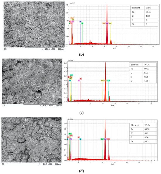 It can be seen from the SEM images in Figure 11a,b for Test-1A and Test-2A, respectively, that the surface was uniformly corroded and covered with a black film, indicating a possible formation of an iron carbonate layer with 0% sulphur. However, the SEM image of the Test-3A surface was covered with black film, and pitting was detected, with 0.01% sulphur. As shown in Figure 11d, for Test-4A, a more severe pitting-like surface was observed than in Figure 11c, with 0.04% sulphur.