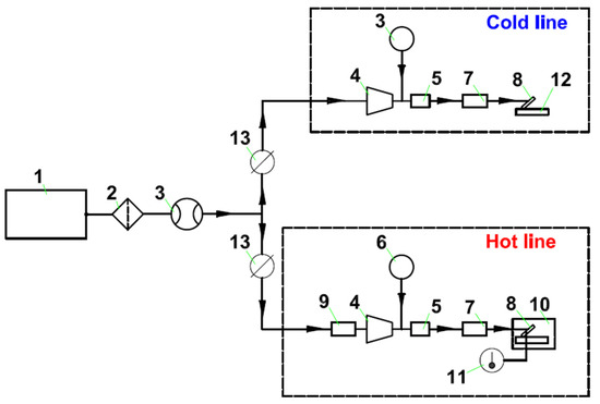 Schematic diagram of an experimental rig for conducting research on the solid particle erosion resistance of materials and coatings. 1—compressor; 2—filter; 3—rotameter; 4—nozzle (Venturi tube); 5—mixing chamber; 6—particle dispenser; 7—stabilizing tube; 8—sample; 9—heating element; 10—ceramic heater; 11—thermoelectric converter; 12—sample holder for low-temperature tests; 13—rotary valve.