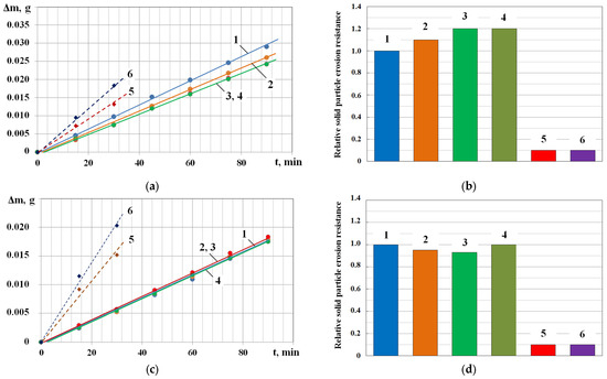 Wear curves and relative solid particle erosion resistance during a 90-min exposure time of the uncoated specimens (1), specimens with nitriding of type I (2), type II (3), and type III (4), and specimens with boriding of type I (5) and type II (6) of 30 L steel at flow impact angles of 30° (a,b) and 90° (c,d). 5,6—high wear rate was recorded; tests were stopped after 30 min of exposure.