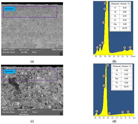 The cross-sectional SEM image and EDS chart of the elemental composition analysis: (a,b) 30 L steel modified by nitriding (type III); (c,d) 30 L steel without modifying.