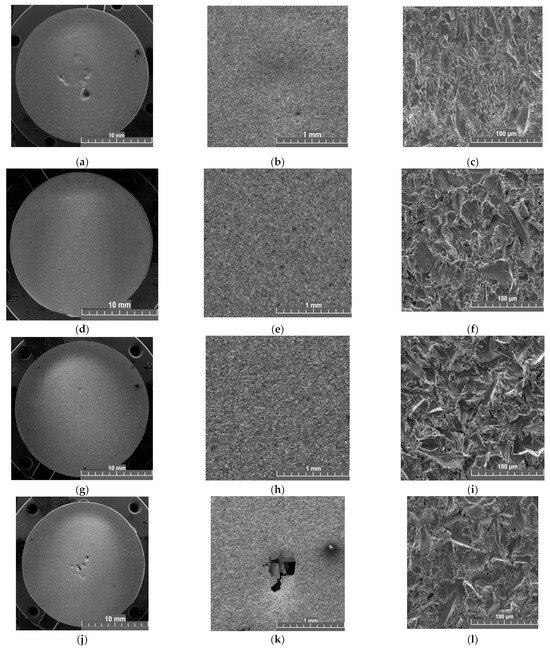 Surface images of 30 L steel specimens without (a–c) and with nitriding of type I (d–f), type II (g–i), and type III (j–l) after solid particle erosion exposure at a flow impact angle of 90°.