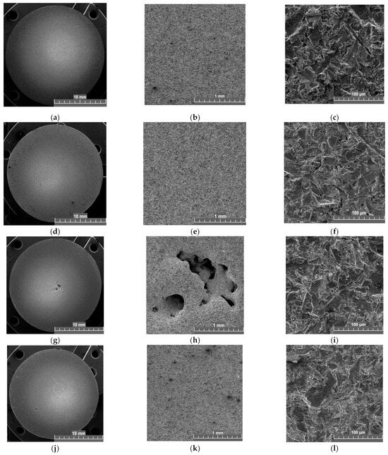 The microscopic analysis of the specimen surfaces after the test showed that the character of the surface microrelief change is generally identical for all the studied specimens (see Figure 7 and Figure 8). The central parts of the specimens subjected to the greatest wear during the test can be considered morphologically as a single surface of fracture. Numerous erosion damage, such as multidirectional traces of microfractures left by abrasive particles, are observed on the surfaces. The typical length of such traces is up to 20–30 μm. Brittle–ductile failure occurs in the vicinity of these traces, while signs of plastic deformation preceding fracture are observed at the edges of the traces.