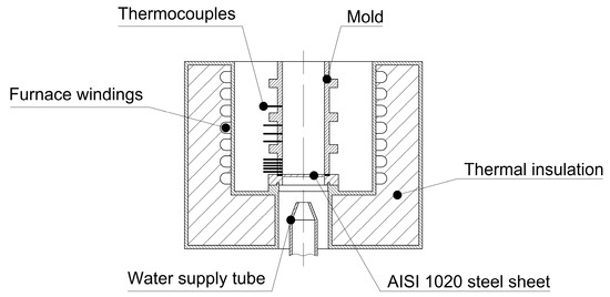 The cylindrical split mold possessed the internal dimensions of 60 mm in diameter and 150 mm in height and featured passing holes for the placement of thermocouples at nine designated positions (P = 3.5, 7.5, 9, 14, 20, 35, 50, 62, and 85 mm), with the casting base serving as the reference location. Temperature monitoring was conducted at a 5 Hz frequency throughout the cooling process using K-type thermocouples inserted into the molten alloy. These thermocouples were connected to a data logger system (Lynx, São Paulo, Brazil) which, in turn, was linked to a computer for the treatment and recording of thermal data. When the temperature had sufficiently decreased, surpassing the alloy’s liquidus temperature (TL) by 5%, the electric heaters were deactivated, and water flow was initiated, marking the initiation of upward directional solidification (DS). It is noteworthy that the mold’s base, made of AISI 1020 steel, was not coated with alumina, allowing direct contact with the liquid metal.
