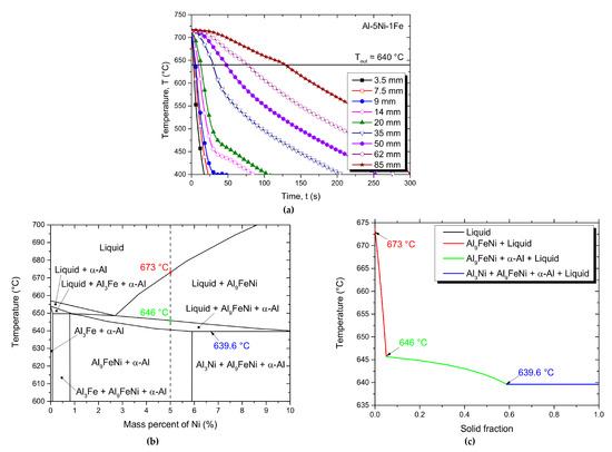 (a) Cooling curves recorded at different heights from the bottom of the casting for the Al-5Ni-1Fe alloy. (b) Partial pseudo-binary phase diagram of Al-1Fe-Ni with a vertical dashed line denoting the Al-5Ni-1Fe alloy composition. (c) Scheil–Gulliver solidification path of the Al-5Ni-1Fe alloy.