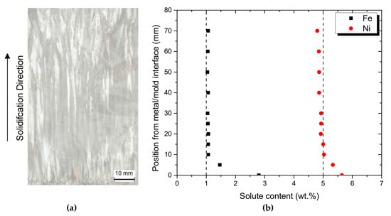 (a) Solidification macrostructure, and (b) profiles of macrosegregation for Fe and Ni along the length of the DS Al-5Ni-1Fe alloy casting.