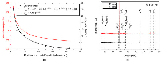 (a) Profiles of Veut and Ṫeut as functions of P for Al-5Ni-1Fe alloy casting, and (b) XRD patterns obtained from four samples extracted along the length of the DS Al-5Ni-1Fe alloy casting.