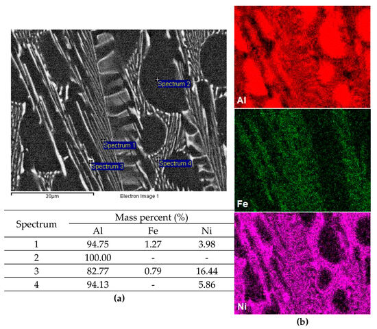 Figure 6a shows a SEM image with punctual EDS analysis on a longitudinal section of an Al-5Ni-1Fe alloy, cooled at a rate of 1.2 °C/s. The local mass percent concentrations of Al, Fe, and Ni are displayed within the table integrated into this figure. The analysis identified three phases: an α-Al matrix (Spectrum 2), Al3Ni (Spectrum 4), and Al9FeNi (Spectrums 1 and 3). Elemental SEM/EDS mapping for an Al-5Ni-1Fe alloy, cooled at a rate of 1.2 °C/s, is depicted in Figure 6b. This mapping illustrates the distribution of elements. The matrix is predominantly composed of Al (red), which is also present in the eutectic colony. The eutectic colony exhibits a significant concentration of Ni (magenta) and trace amounts of Fe (green) as well.