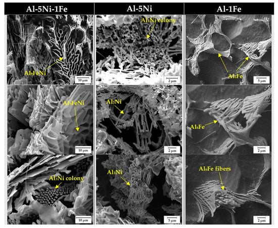 Figure 7 illustrates the morphology of the intermetallic phases in the Al-5Ni-1Fe, Al-5Ni, and Al-1Fe alloys with greater clarity via SEM images. Each alloy sample underwent an extended chemical etching (aggressive etching) process to enhance the visibility of microstructural features for morphological examination and the analysis of Al9FeNi, Al3Ni, and Al6Fe intermetallic compounds (IMCs). This step entailed the application of an aqua regia reagent for 3 min for samples of the Al-5Ni-1Fe alloy, selectively removing the Al-rich matrix while preserving other phases in the surrounding areas. For both binary alloys, Al-5Ni and Al-1Fe alloys, the reagent used was a 1 M NaOH solution, and the immersion time was approximately 1 h.