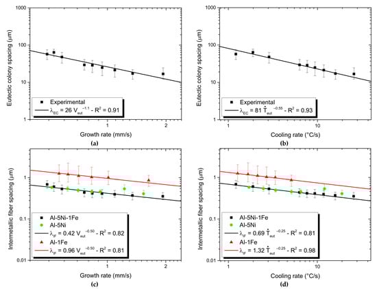 Profiles of eutectic colonies spacings as functions of (a) growth rate and (b) cooling rate for the Al-5Ni-1Fe alloy casting. Profiles of intermetallic fibers spacings as functions of (c) growth rate and (d) cooling rate for the Al-5Ni-1Fe, Al-5Ni and Al-1Fe alloys.
