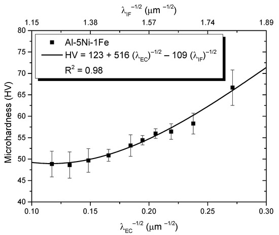 Figure 10 illustrates the correlation of hardness in the Al-5Ni-1Fe alloy with the inverse of the square root of λEC and λIF (in a Hall–Petch type format), employing a multiple linear regression (MLR) function. A constant value of 48 HV for the Al-5Ni was reported in reference [24] while the Al-1Fe alloy exhibited 27 HV across the entire microstructural range, based on measurements taken from the produced samples. In Table 1, it is noteworthy that the p-value is below 5%, describing the significant contribution of the two microstructural parameters (λEC and λIF) obtained in the MLR fit. In contrast to the ternary alloy studied here, the other two binary alloys exhibit microstructural phases with more defined morphologies. Hypoeutectic Al-Fe and Al-Ni alloys are known to present cellular [31] and dendritic morphologies [24], respectively. However, the present work does not provide data on cell and dendrite arm spacings, as the only shared microstructural parameter among the three alloys examined is λIF. In other words, λIF is measured within the eutectic mixture situated between the cellular and dendritic structures, as well as within the eutectic colonies. It is worth mentioning that measurements of λEC were not available for the mentioned binary hypoeutectic alloys.