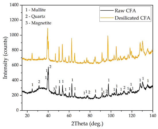 CFA used in this investigation was taken from the Reftinskaya TPP in Asbest, Russia, where coal is pulverized into boilers for combustion at a temperature higher than 1300 °C. Table 1 shows the concentration of main components in CFA and CFA after desilication (DCFA) with NaOH at 110 °C, 20 min, an L:S ratio of 10:1, and an NaOH concentration of 400 g L–1. Desilication was carried out with simultaneous magnetic fraction recovery []. Table 1 shows that the raw CFA is composed of 62.43 wt.% of SiO2, 24.66 wt.% of Al2O3, and 3.32 wt.% of Fe2O3. After desilication with magnetic fraction recovery, the Al2O3 content increases to 44.30 wt.%, while the SiO2 and Fe2O3 content reduce to 36.17% and 1.83%, respectively. The Na2O content in DCFA did not exceed 1 wt.%. Prior to conducting a kinetics investigation, DCFA underwent a sieving process to obtain a narrow particle size range of 50 µm to 73 µm. The Al2O3 and Sc content of this fraction was almost identical to DCFA and was 44.45% and 0.0041%, respectively. Figure 1 shows the results of XRD analysis of CFA and DCFA samples. Particle size distribution of DCFA can be found elsewhere [,].