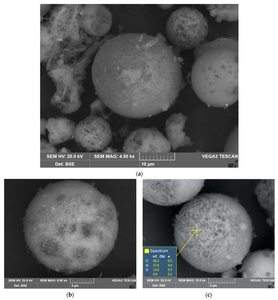 SEM-EDS images of (a) DCFA at a magnitude of 4500×; (b) mullite sphere at a magnitude of 9000×; (c) mullite sphere at a magnitude of 10,000×.