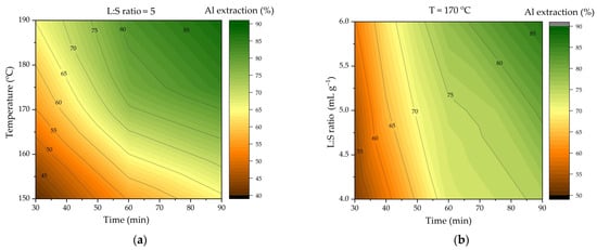 Figure 3 illustrates that the leaching time and temperature exert a significant influence on the extraction of Al. The increase in leaching time from 30 to 90 min at 170 °C results in an increase in Al extraction from 55% to 79%. The increase in temperature from 150 to 190 °C results in an increase in the extraction of Al from 64% to 87% after 90 min of leaching. The increase in the L:S ratio from 4 to 6 at 170 °C results in an increase in Al extraction of only 11% after 90 min, as depicted in Figure 3b.