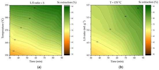 Effect of different leaching parameters on Sc extraction in HCl HPAL: (a) effect of time and temperature at an L:S ratio of 5 to 1; (b) effect of time and L:S ratio at 170 °C.
