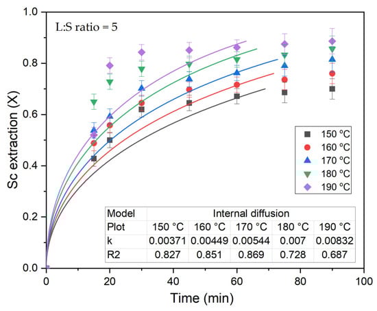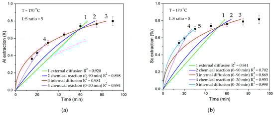 Figure 5b shows that, for Sc extraction, the dissolution proceeds very rapidly during the initial leaching time, and, eventually, saturation is reached. Fitting becomes difficult, but the internal diffusion equation still fits better. When describing the initial 30 min of leaching, the internal diffusion equation also exhibits a highly satisfactory fit.