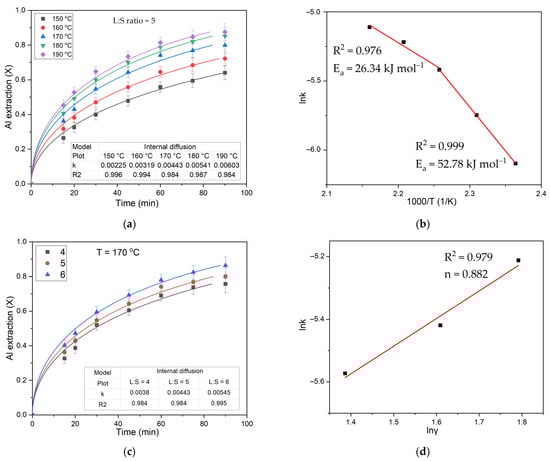 The results of fitting experimental data (points) of Al extraction to equation for the internal diffusion (lines): (a) the diffusion through the product layer for the effect of temperature; (b) relation between logarithm of rate constant and the reverse temperature; (c) the diffusion through the product layer for the effect of L:S ratio; and (d) relation between logarithm of rate constant and logarithm of L:S ratio.