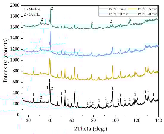 To discover the solid phase, which may be an inert product that limits diffusion, the residue from the HCl leaching of DCFA was examined. The XRD patterns of DCFA residues after the HPAL process at different temperatures and leaching times are shown in Figure 8. It is evident that the XRD pattern of residue obtained at a temperature of 150 °C after a duration of 5 min of leaching exhibits no significant changes in comparison to the raw DCFA sample. A significant decrease in the intensity of the mullite peaks is observed after 15 min of leaching at T = 170 °C. This is likely to explain the high Al extraction rates at the initial moment of leaching.