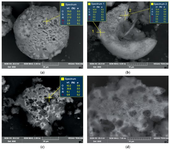 The desilication process appeared to result in the absence of an amorphous glassy mass in DCFA (galo at 20–50° in the raw CFA). The morphology of DCFA particles was examined using SEM-EDX analysis (Figure 2). Figure 2 shows that DCFA consisted of spherical agglomerates of needle-shaped mullite particles. In this study, chemical reagents of analytical quality (NaOH and HCl) were used.