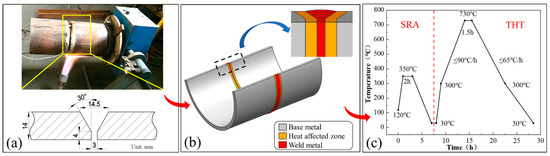 (a) Pre-weld preheating and groove profile, (b) configuration of welded joints, and (c) post-weld heat treatment process: stress relief annealing (SRA) and tempering heat treatment (THT).