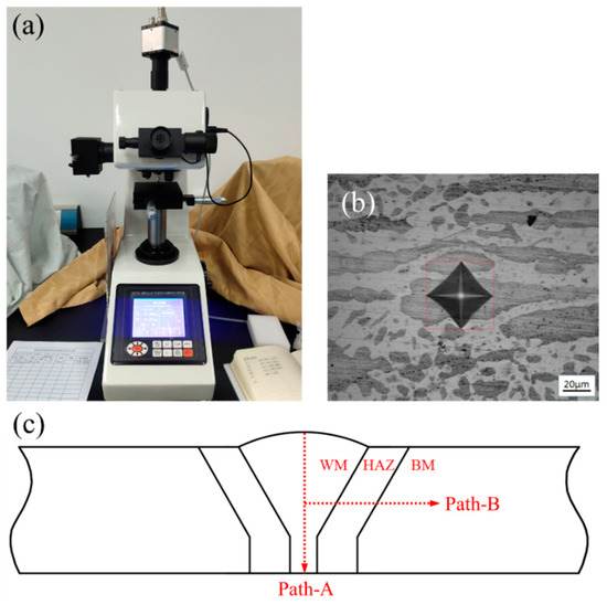 Micro-hardness test: (a) microvickers hardness tester, (b) indentation morphology, and (c) testing paths.