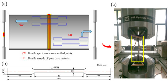 In order to comprehensively understand the mechanical performance of welded joints at the stress relief annealing and tempering heat treatment conditions, a series of mechanical tests were performed. Firstly, the microvickers hardness tests were carried out on the welded joints after stress relief annealing and tempering heat treatment using a TH-701 digital microvickers hardness tester (manufactured by ARTRAY Corporation of Japan). The test was conducted with an applied load of 1.96 N and a holding time of 15 s. The testing path and indentation morphology are illustrated in Figure 3. Secondly, the standard tensile tests of cross-welded joints were conducted in accordance with the standards GB/T 2651-2008 (Tensile Testing of Welded Joints) [31] and GB/T 228.1-2010 (Tensile Testing of Metallic Materials) [32]. The tensile tests were performed on an MTS series hydraulic servo universal testing machine (MTS Landmark 370.10 produced by MTS Systems (China) Co., Ltd. in Shanghai, China). During the tests, the displacement of the specimen was controlled at 0.5 mm/min up to the final rapture. The geometric configurations and sampling locations of the specimen are depicted in Figure 4.