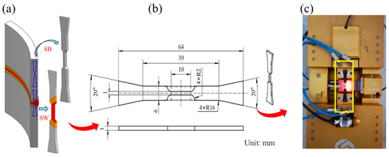 High-temperature tensile test for miniature plate: (a) sampling diagram of miniature plate tensile specimen, (b) miniature plate sample size, and (c) testing process.