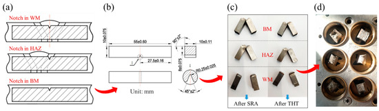 Furthermore, since 12Cr1MoV steel pipe needs to be served in a high-temperature environment, in order to more comprehensively evaluate the effect of the stress relief annealing and tempering heat treatment, its tensile property at different temperatures from room temperature to high temperature was tested. Due to the limited availability of test materials, tensile tests of miniature specimens were conducted using a Mtest3000-F-K micro flat tensile testing machine (produced by Changchun Mechanical Science Research Institute Co., Ltd. in Changchun, China) to evaluate the tensile properties at different subzones under various temperatures. The displacement was controlled as 0.1 mm/min at different temperatures of 27 °C, 400 °C, 470 °C, 500 °C and 538 °C. The geometric configurations and sampling locations of miniature samples are shown in Figure 5. Finally, the impact testing of the welded joints at various micro-regions was also carried out at room temperature using a JBN-300 pendulum impact testing machine (produced by Jinan Union testing Technology Co., Ltd. in Jinan, China) following the standards GB/T 229-2007 (Charpy V-notch Impact Test on Metallic Materials) [33] and GB/T 2650-2008 (Impact Test on Welded Joints) [34]. Standard Charpy V-notch impact specimens were used with the notches oriented parallel to the weld bead. Note that impact properties at different subzones were evaluated based on the locations of the notch, and the fractography observation was also performed on the electron probe microanalyzer (JXA-8230 produced by JEOL (BEIJING) CO., Ltd. in Beijing, China). The geometric configurations and sampling locations of V-notch specimens are depicted in Figure 6. Note that in the tensile test and impact toughness test, three samples with the same sampling position were tested in each group of experiments, and the average value of test results was selected.