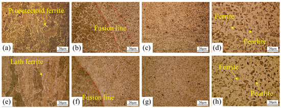 Microstructure after stress relief annealing for (a) weld metal zone, (b) fusion zone, (c) fine grain heat-affected zone, (d) base metal zone and after tempering heat treatment for (e) weld metal zone, (f) fusion zone (g) fine grain heat-affected zone, and (h) base metal zone.
