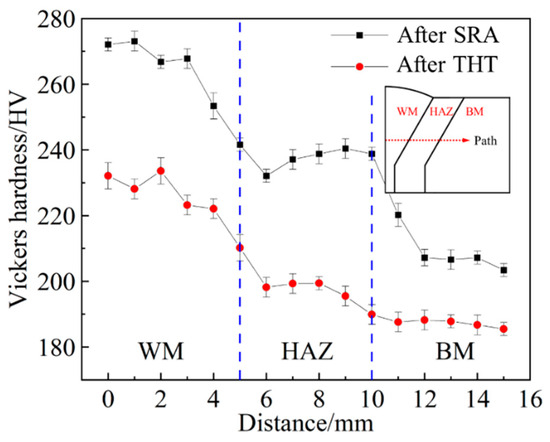 Distribution of microhardness across the welded joints at stress relief annealing and tempering heat treatment conditions.