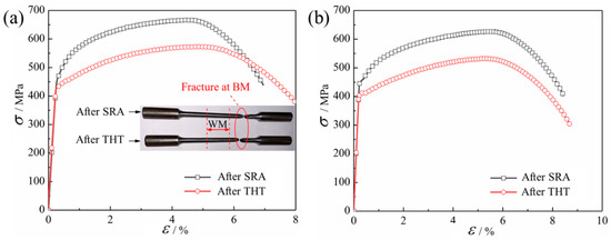 The tensile stress-strain curves obtained by standard specimen for the cross-welded joint and base material at room temperature are shown in Figure 9. Note that the final fracture occurred in the base material zone for the specimens at both stress relief annealing and tempering heat treatment conditions. There may be two reasons, i.e., first, the alloying elements in the welding rod are higher than those in the base metal (as shown in Table 1), indicating a high-strength match for the welding process. Second, the coarse-grained region in the heat-affected zone experiences alloy strengthening due to element diffusion from the weld metal, at the same time, the fine-grained zone, characterized by small and uniformly distributed grain sizes, contributes to fine-grain strengthening in the heat-affected zone. As a result, the overall strength of the heat-affected zone is higher than that of the base metal.
