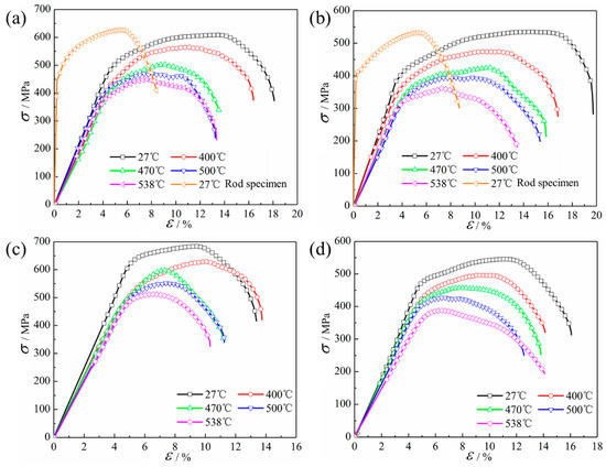 Tensile stress-strain curves at different temperatures for (a) annealing base metal, (b) tempering base metal, (c) annealing cross-welded joints, and (d) tempering cross-welded joints.