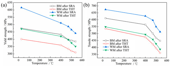 Figure 10a,b displays the tensile curves at various temperatures for the base metal and cross-welded joints at the stress relief annealing and tempering heat treatment conditions. The room-temperature tensile curves obtained by standard specimens are also provided for comparison. It is evident that the elastic modulus of the micro-sized specimens is significantly lower than that obtained from the standard specimens. Research by Yang et al. [35] has shown that this difference is primarily caused by deformations and clamping effects induced by the fixtures and the insufficient stiffness during the tensile phase of micro-flat specimens. However, the yield strength and ultimate tensile strength of the micro-sized specimens are in great agreement with the results from standard specimens. Therefore, employing miniature specimens to characterize the strength of different regions of the welded joint is effective and feasible.