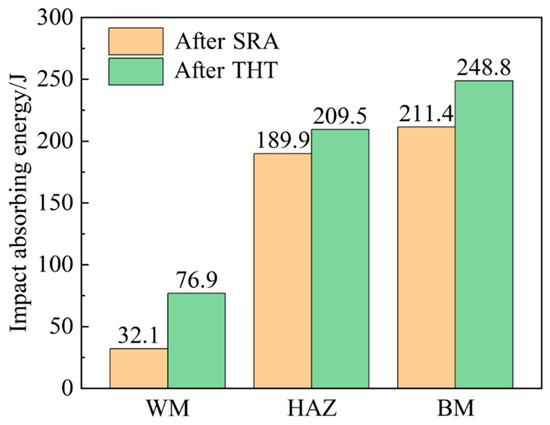 Figure 12 gives the evolution of impact absorption energy at different subzones of welded joints at the stress relief annealing and tempering heat treatment conditions. It is clearly found that the impact absorption energy follows the order of base metal > HAZ > weld metal. The higher impact toughness of the base metal can be attributed to its uniform microstructure consisting of ferrite and pearlite, with pearlite exhibiting better toughness than bainite. The HAZ has a more complex microstructure, resulting in slightly lower toughness, while the presence of bainite in the weld metal reduces its impact toughness. In addition, the values at tempering heat treatment conditions are greater than those at stress relief annealing conditions.