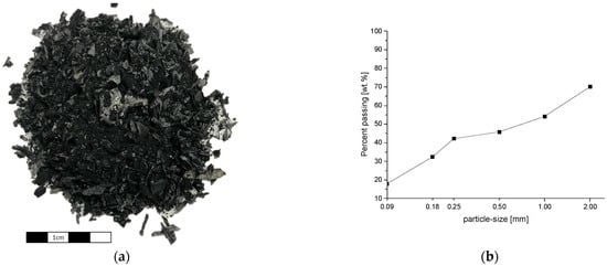 For the thermal treatment trials, inert shredded NMC 622 LIBs were used. The shredder was provided dried below 100 °C and under a slight vacuum. Figure 1a shows a picture of the material, and Figure 1b shows the mass-related particle-size distribution of the material.