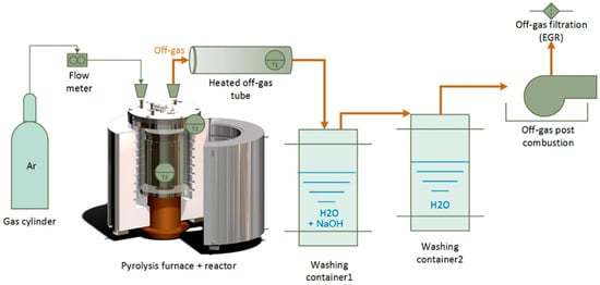 Thermal treatment trials were carried out in a resistance-heated furnace. A cylindrical steel bomb of 19 L volume with a water-cooled lid is placed inside of it. The water cooling is necessary to protect the rubber sealings of the lid from the heat and, therefore, ensure gas tightness during the process. Two thermocouples and a lance for gas injection are inserted through the lid. One of the thermocouples is placed in the center of the cylinder and inside the material. The material itself is placed inside a dense sintered alumina crucible. To prevent material losses through the exhaust gas pipe, the crucible is placed inside a second 2.5 L steel chamber with a labyrinth system for the exhaust gas. The exhaust gas is fed via a pipe heated to 350 °C (avoidance of condensation) to a two-stage scrubber. The first one is filled with NaOH solution to remove halogens like fluorine. Simultaneously, high-boiling organics are condensed. The second scrubber is filled with water and serves for post-cleaning. After scrubbing, the gas is fed to a thermal post-combustion to crack organic compounds. The setup is schematically shown in Figure 2.