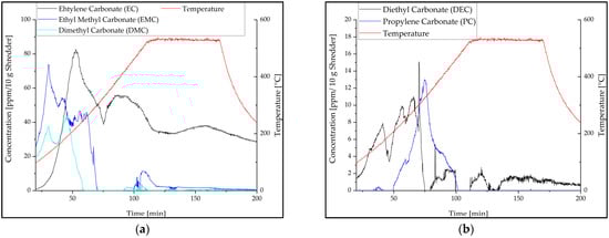 The main components, according to Figure 3, are ethylene carbonate (EC) and ethyl methyl carbonate (EMC) since they are detectable in the highest concentration of up to 80 ppm/10 g shredder. Even though the shredded material was provided dried, the low boiling [] components DMC, EMC and diethyl carbonate (DEC) were detectable from the beginning of the trials due to their high vapor pressure. EC and PC are released at higher temperatures, according to their higher boiling points (246 °C and 242 °C) [], and reach their peaks at 220 °C (EC) and 325 °C (PC). EC is the only component continuously measured during the whole trial. It has the highest boiling point of 246 °C [], so it can condensate at the water-cooled lid of the furnace and also in the FTIR system, which is heated to 180 °C. The constant release of the condensate could lead to its measurement during the whole trial. Since PC is present in significantly lower quantities in the material, this phenomenon is not occurring for it.