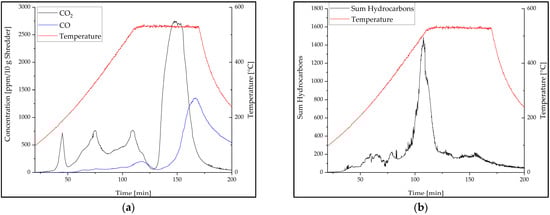 Most of the pyrolysis reactions, which means organic decomposition, take place at around 500 °C with the largest peak of hydrocarbons. It is followed by the largest peak of HF at around 530 °C, according to the decomposition of the binder PVDF [,]. Furthermore, during the holding time at 530 °C, the largest CO2 peak followed by CO release is measured. At this time, the hydrocarbon concentration has already dropped to low concentrations, which leads to the assumption of carbon reactions with metal oxides during the holding time. Reducing reactions with carbon will lead to CO2 and CO release and are further addressed in Section 3.3.